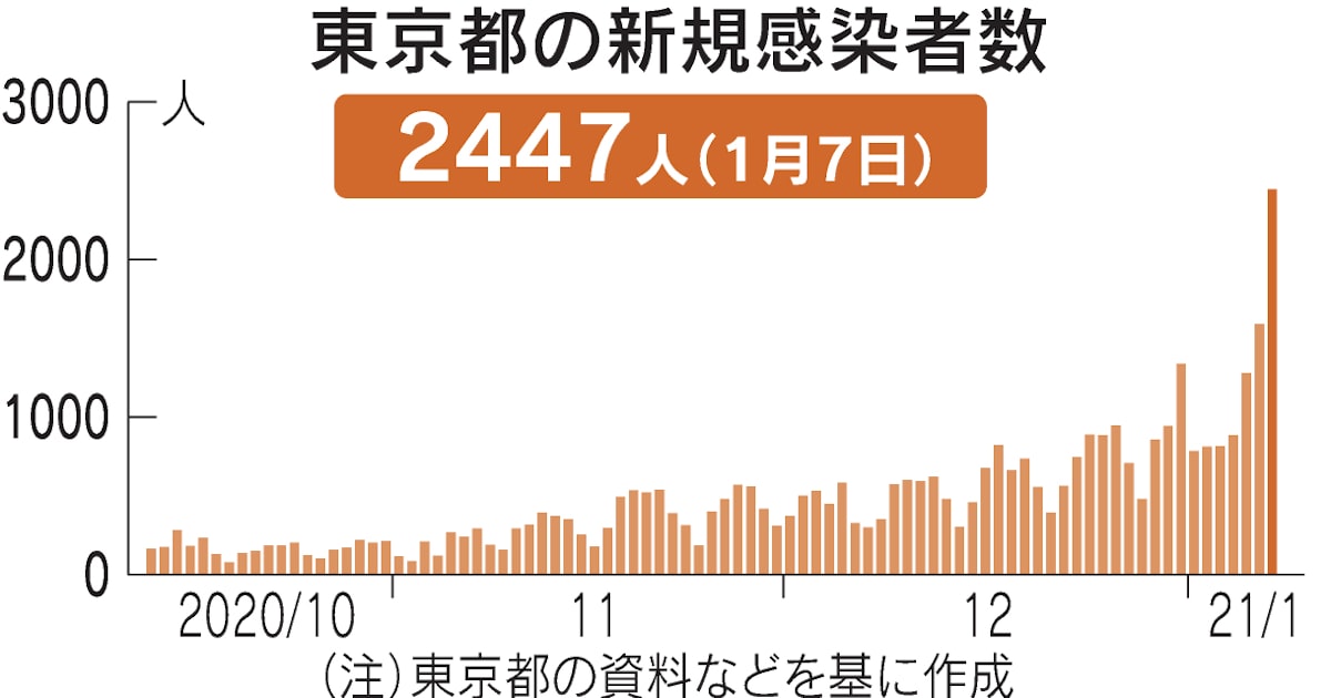 東京都は7日、新型コロナウイルスの感染者が新たに2447人確認されたと発表した。1日当たりの新規感染者が2千人を超えたの...